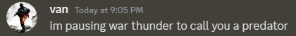 "im pausing war thunder to call you a predator" - 9:05PM PT Jan. 2/2025